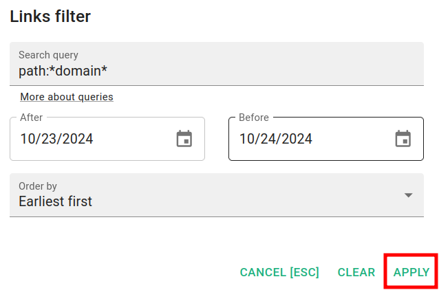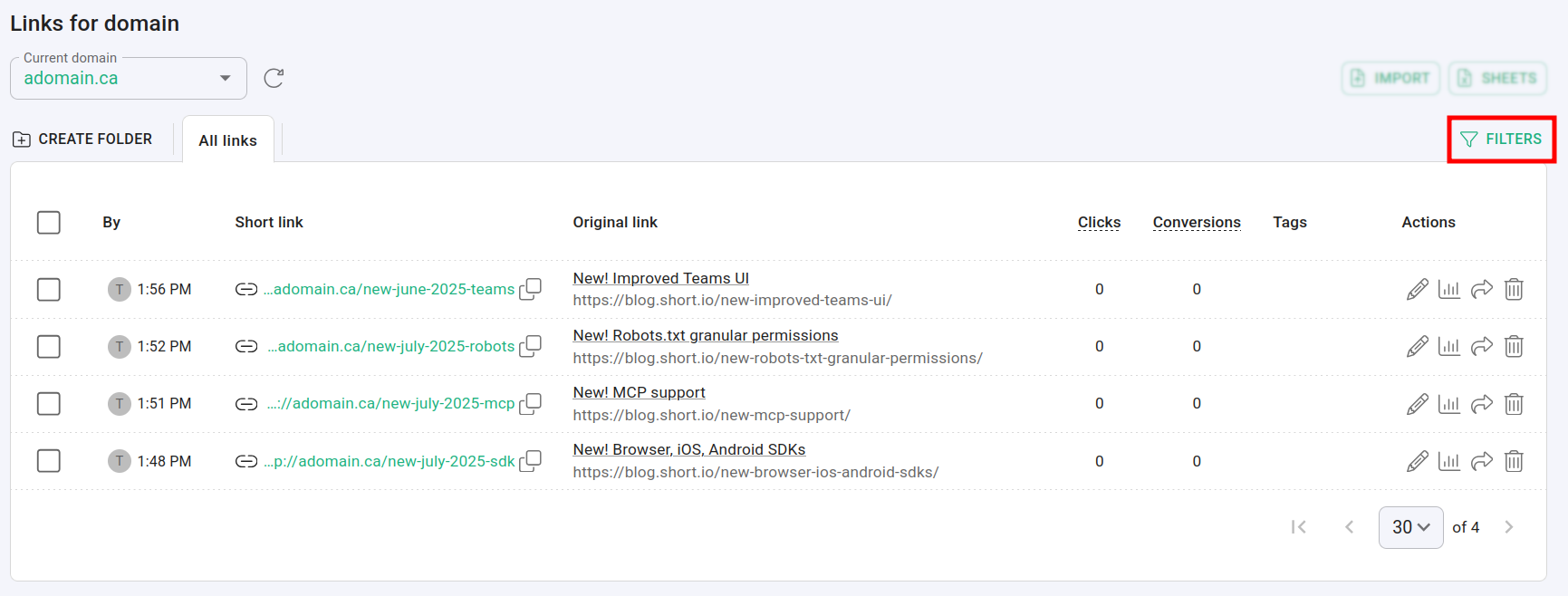 Short.io filters allow you to search for short links by tags, link titles, slugs, original URLs, Android/iOS URLs, expiration links, variation pages and more.