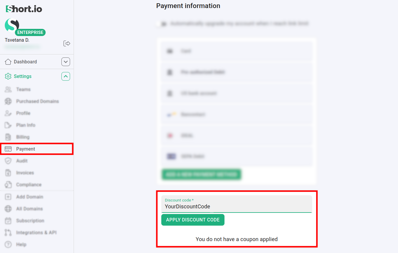 Enter your Discount code and click on Apply discount code.