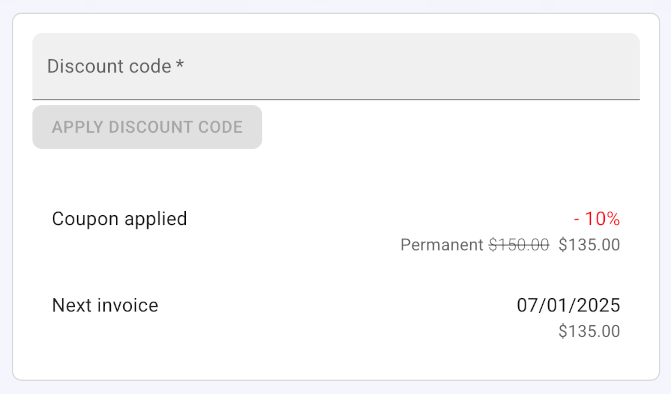The coupon is applied and you can review the details regarding your discount percentage, the upcoming invoice date, and the total amount: