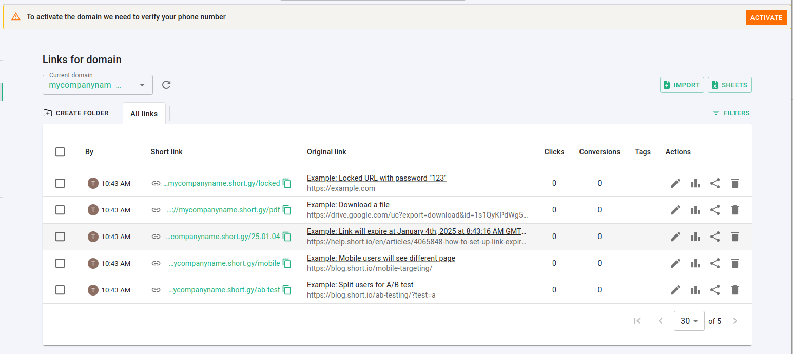 Note: If you have not added (and verified) your phone number in the profile settings, the following message appears: To activate the domain we need to verify your phone number.