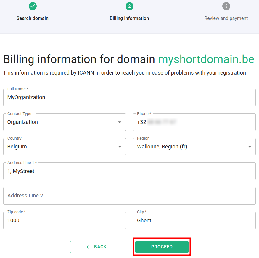 In the next screen provide your billing information and click on Proceed: