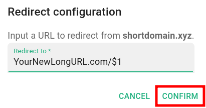 In the next Redirect configuration screen enter the long URL of your new domain followed by /$1: