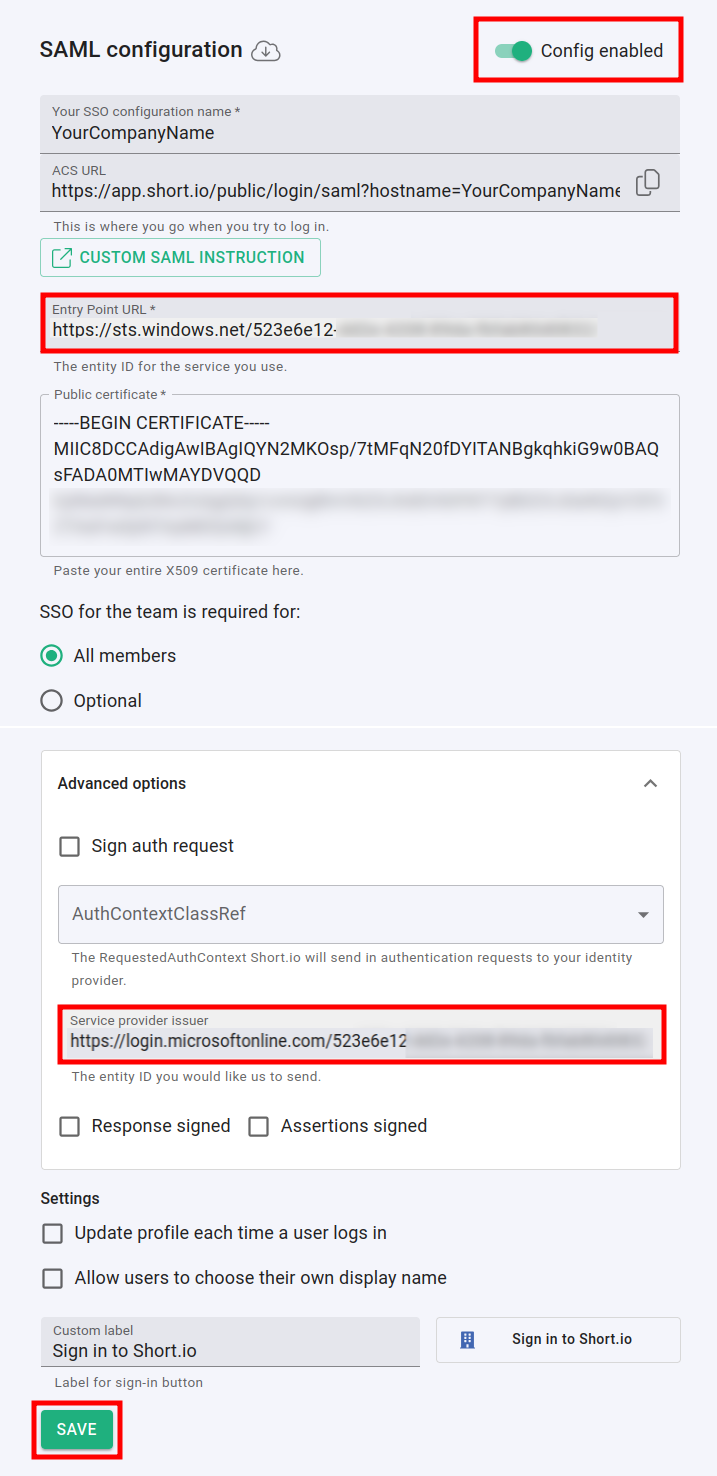 As a corporate administrator, you have the option to permit members of a corporate email to access Short.io without the need for registration. Through Single Sign-On (SSO), Short.io streamlines the identity verification process, enabling your team members to log in without having to set up a password.