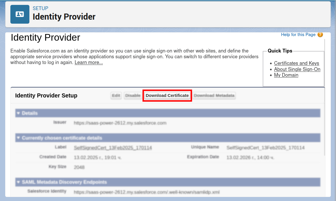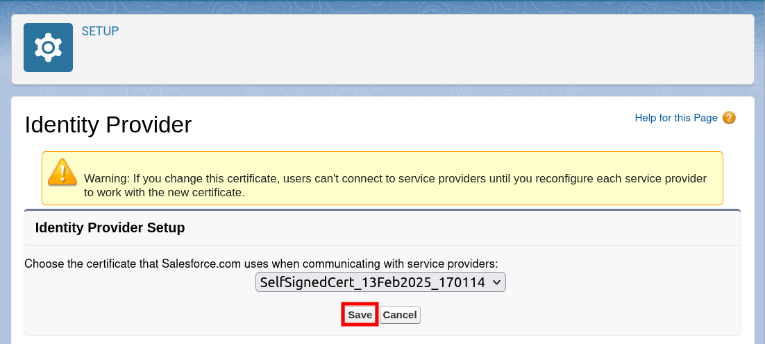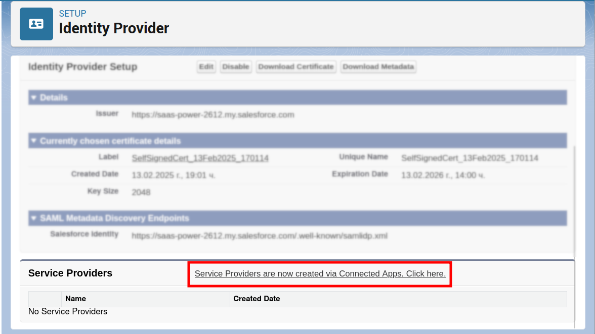 From the Identity Provider Setup panel copy and save in a text document the values of the fields Issuer and Salesforce Identity: