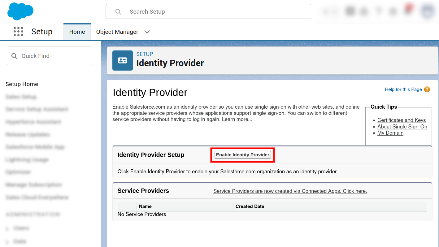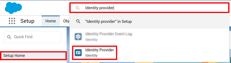 In the search field of the Setup Home page enter Identity provider and select the option with the same name:
