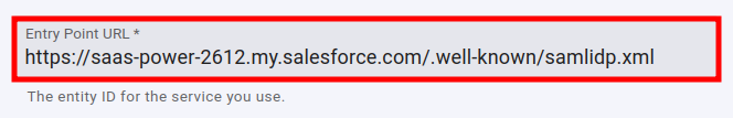 paste the Salesforce Identity value which you copied from the identity settings into the Entry point URL field: