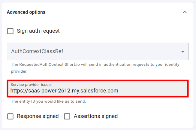expand the Advanced options and paste the Issuer value which you copied from the identity settings into the Service provider issuer field: