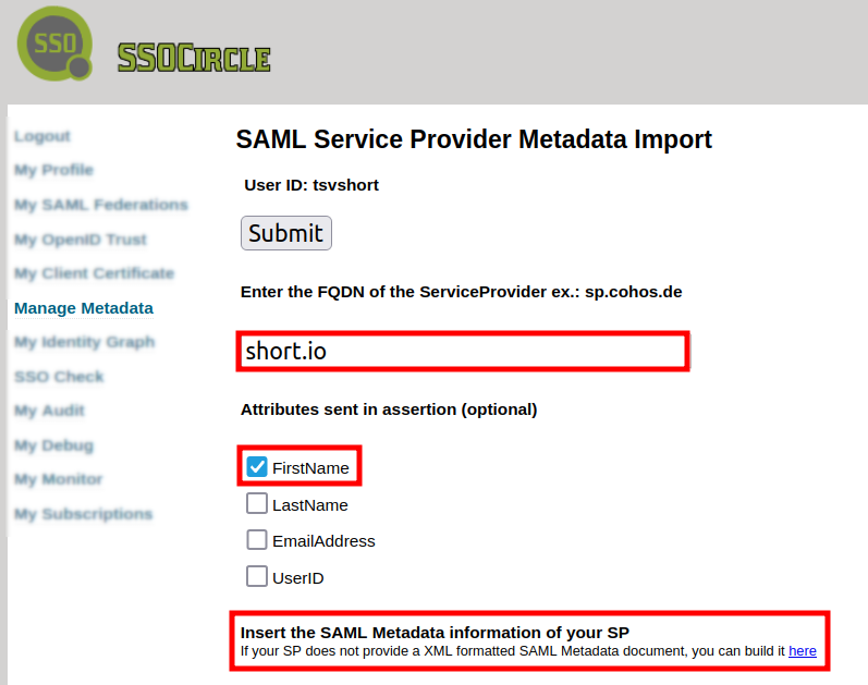 click on the link named "here" to build your SAML Metadata