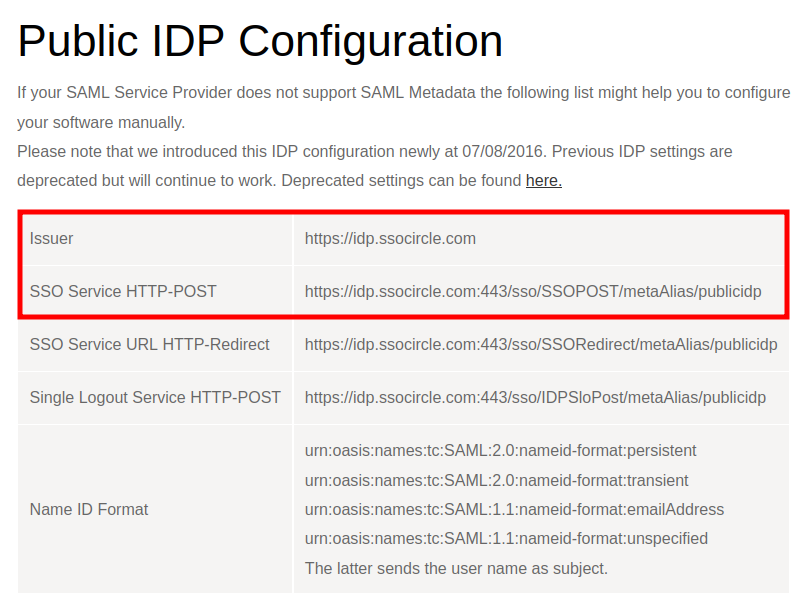 You are redirected to the Public IDP Configuration section. Copy the values of the Issuer and SSO Service HTTP POST fields and save them in a text document: