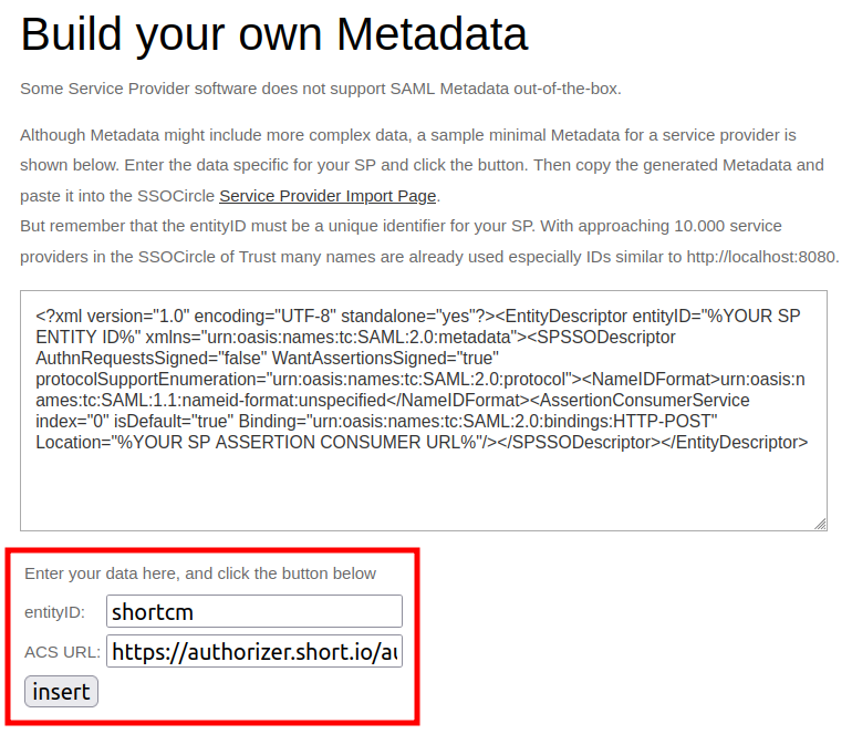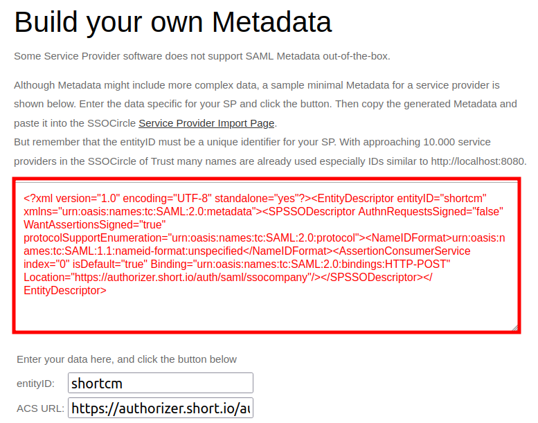 A new Build your own Metadata dialog is opened. Enter shortcm as entityID and [https://authorizer.short.io/auth/saml/