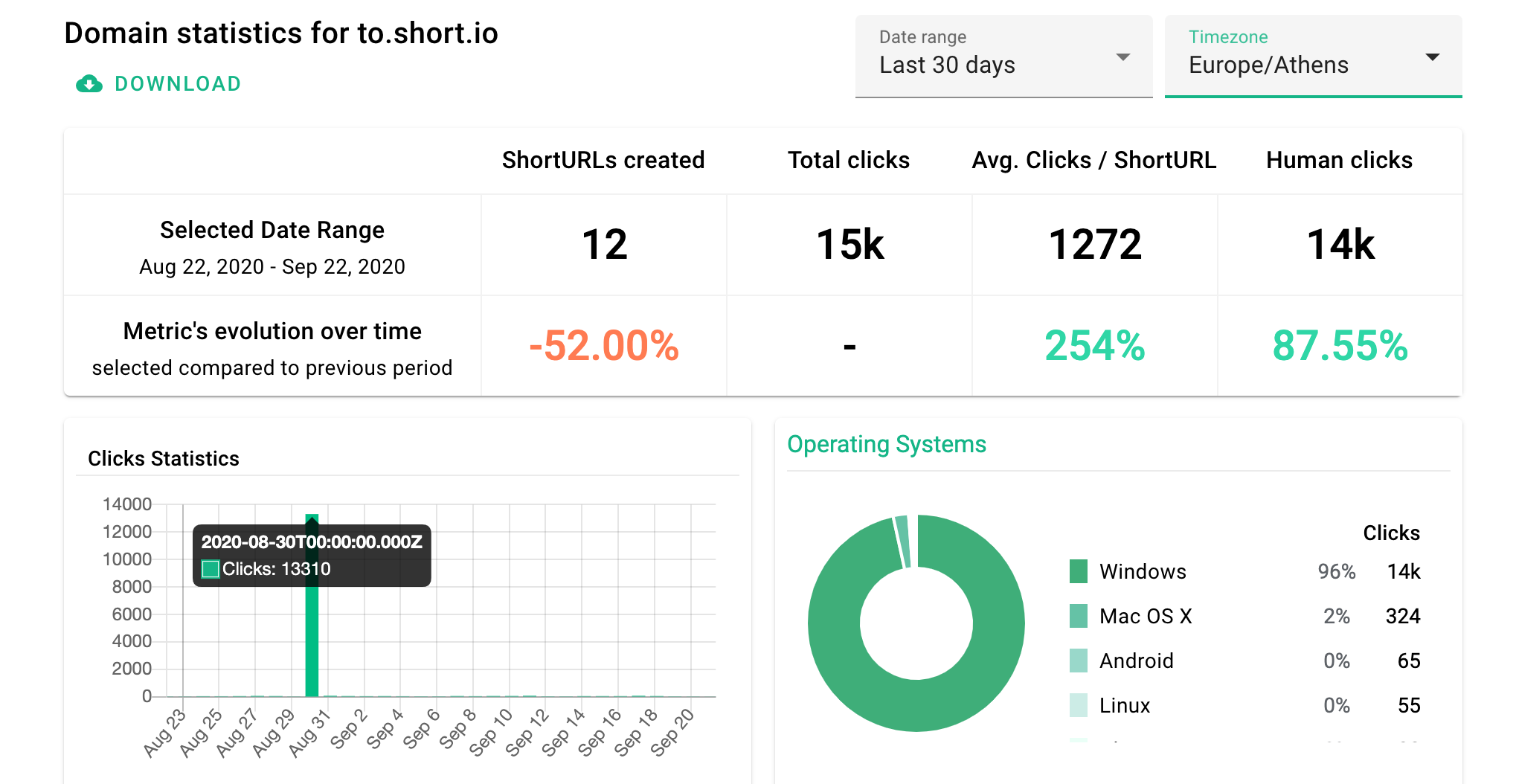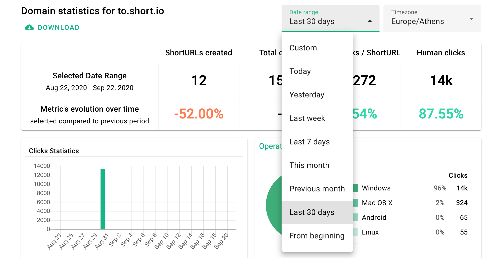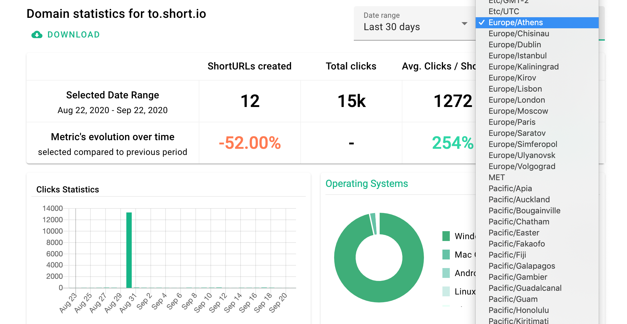 Short.io statistics allow you to update the time zone individually for a domain or link, what is perfect if your target audience is located in different areas of the world.