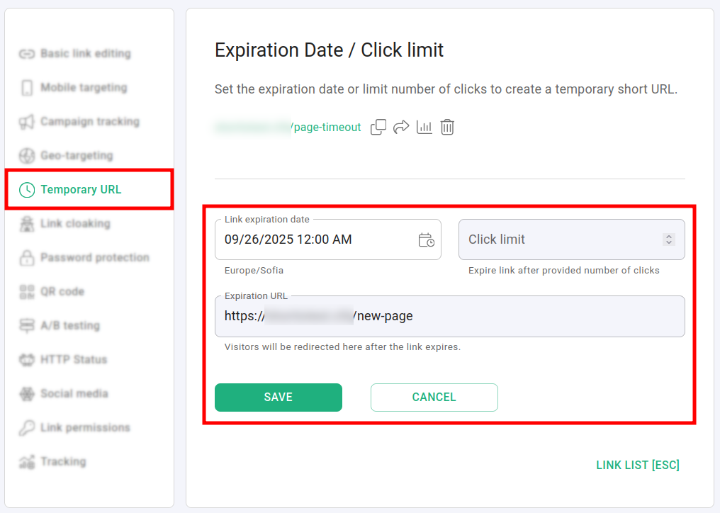 In the Expiration URL field enter the link for which you have enabled cloaking:
