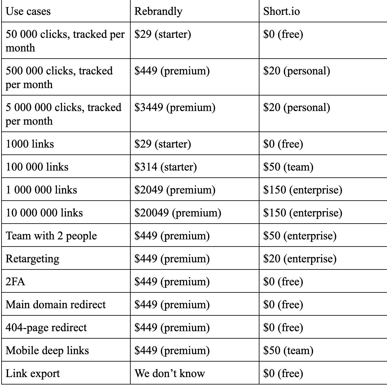 Rebrandly has higher prices than Short.io.