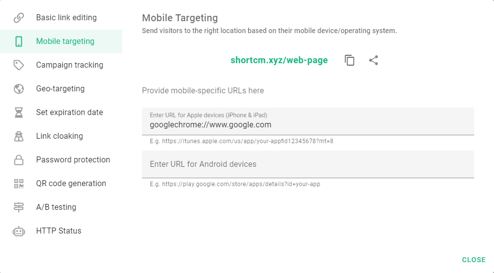 Sometimes you need to make sure the user has opened Google Chrome because some built-in browsers can open a webpage incorrectly. With Short.io mobile links, you can ensure the links open in Google Chrome.