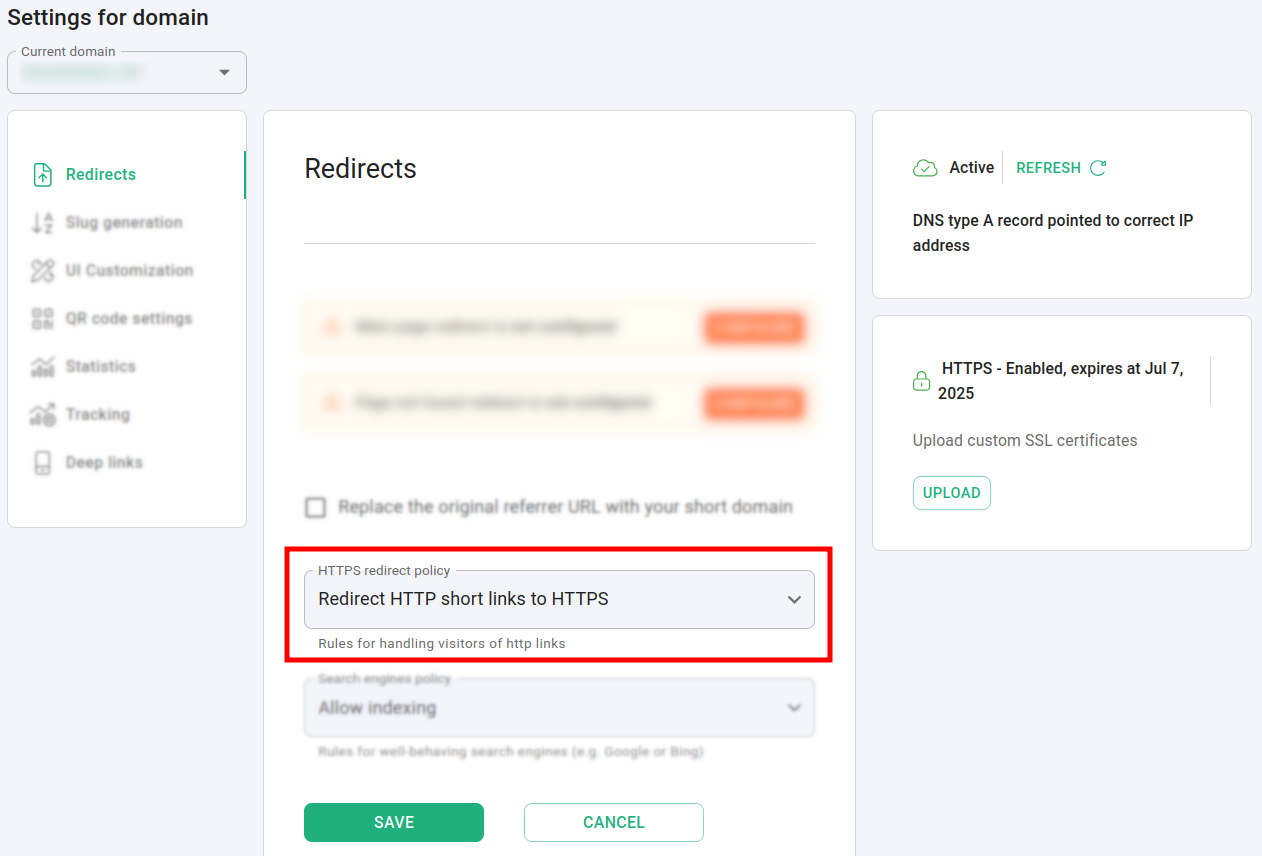 Sometimes SSL certificate cannot be activated, due to an issue with domain configuration. When setting up a short domain for Short.io, A-records that point to Short.io IP addresses take place.